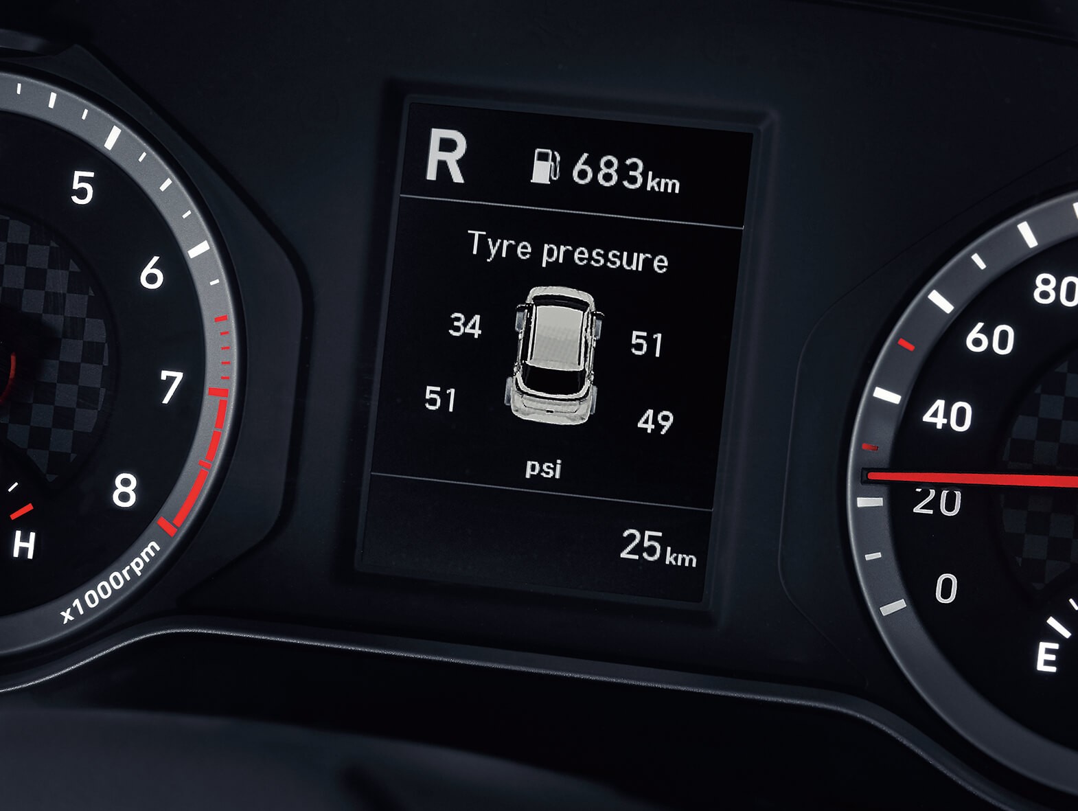 Màn hình thông tin của xe được sử dụng đồng bộ với các mẫu xe Hyundai khác với kích thước 3,5 inch trực quan, có chức năng hiển thị thông tin áp suất lốp trên từng bánh.