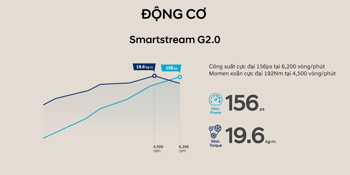 Động cơ xăng Smartstream G2.0, sản sinh công suất tối đa 156 mã lực cùng mô-men xoắn cực đại 192Nm. Đi kèm với hộp số tự động 6 cấp và hệ dẫn động cầu trước.