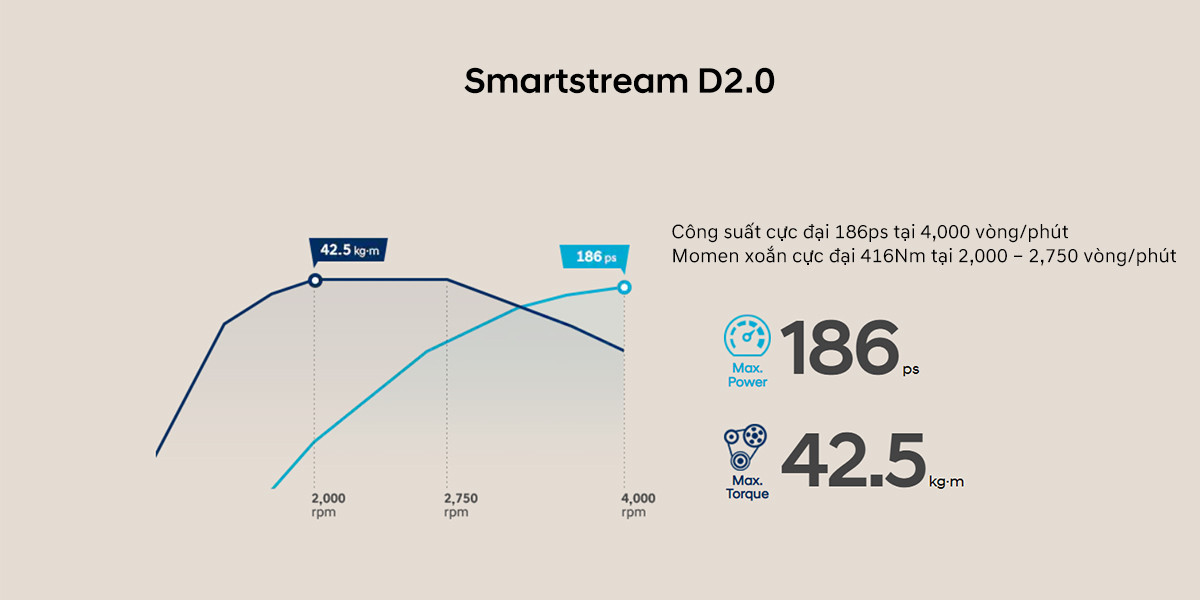 Động cơ dầu Smartstream D2.0, tạo ra công suất tối đa 186 mã lực và mô-men xoắn cực đại 416Nm. Kết hợp cùng hộp số tự động 8 cấp và hệ dẫn động cầu trước.